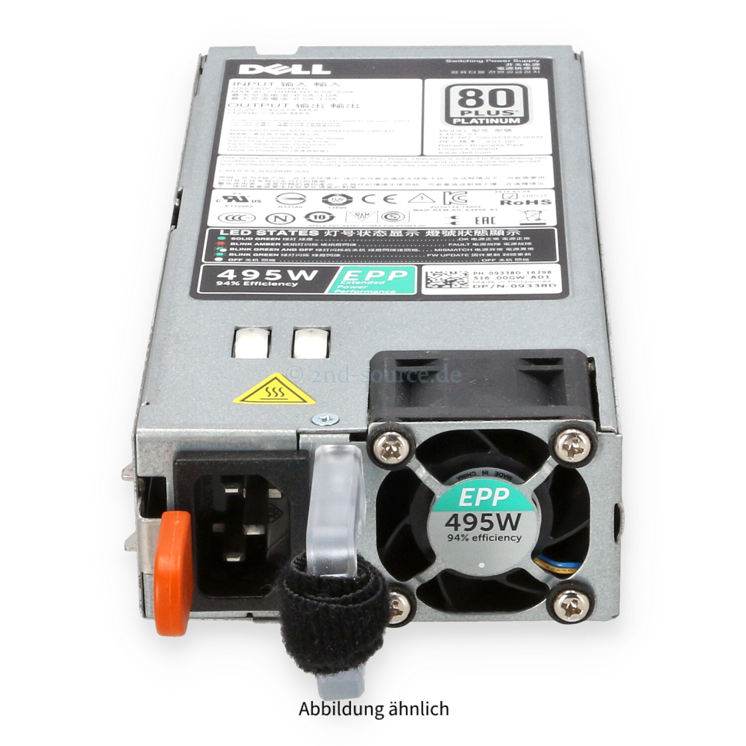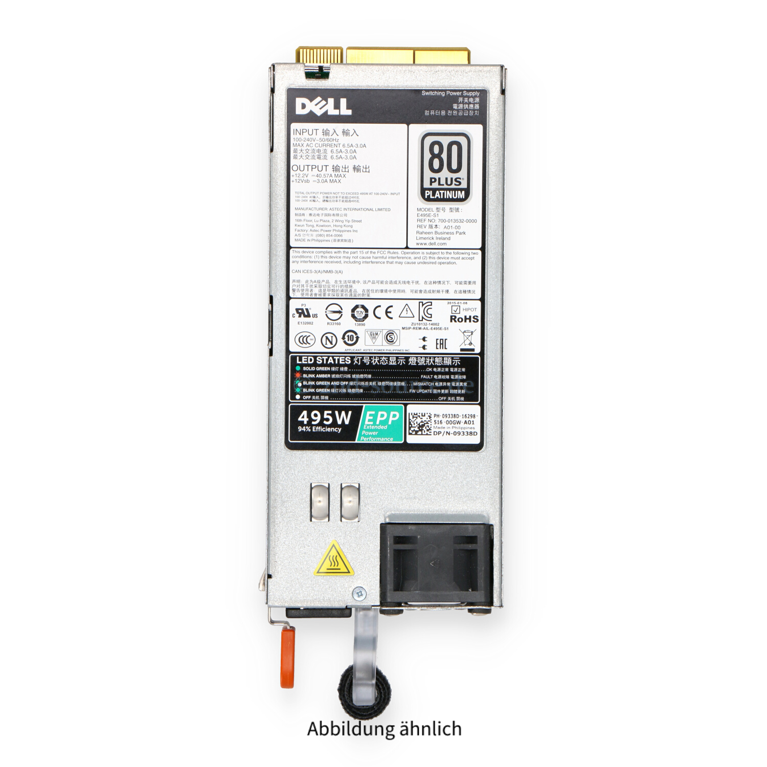 | Modell | Dell 495W 80 Plus Platinum HotPlug Power Supply |